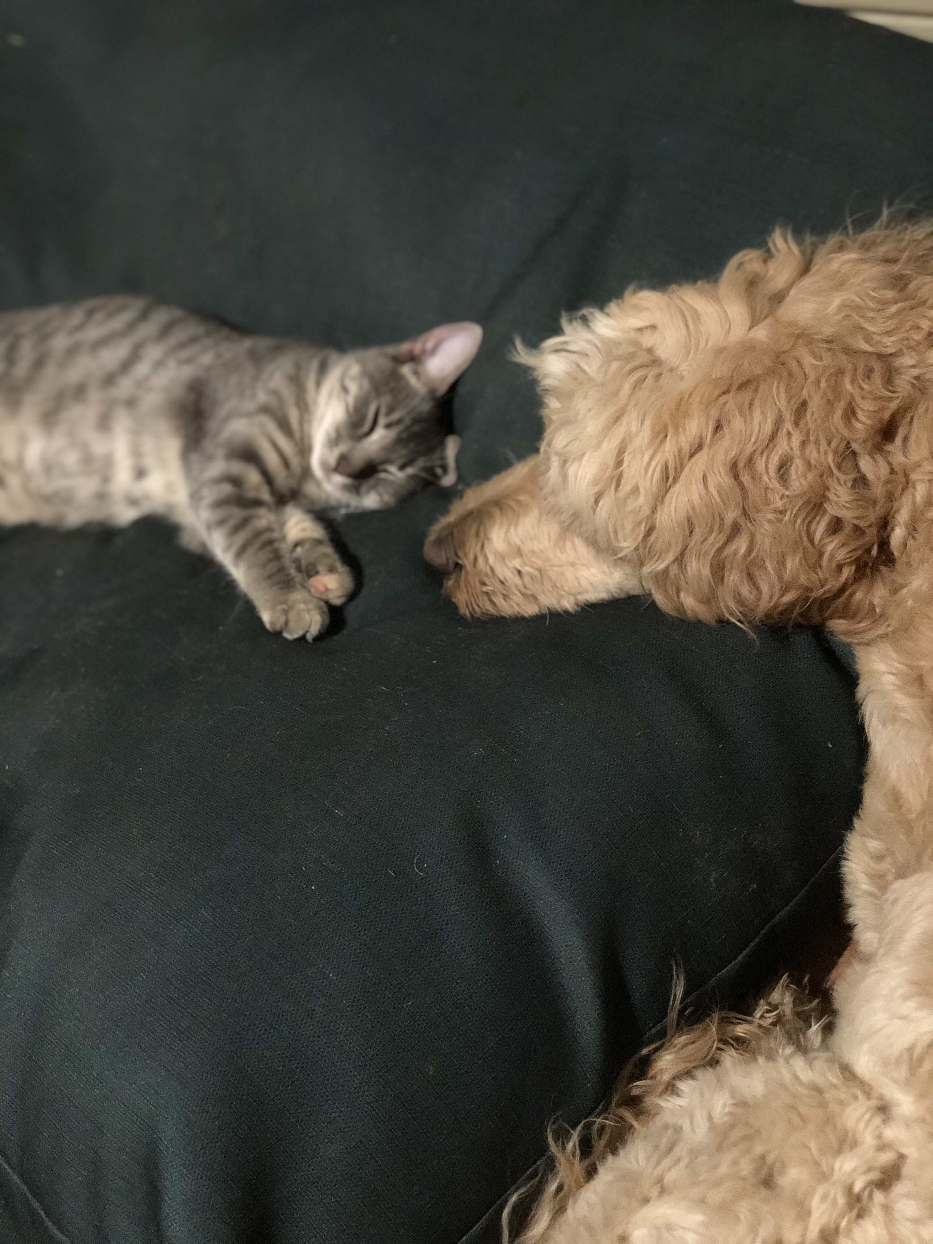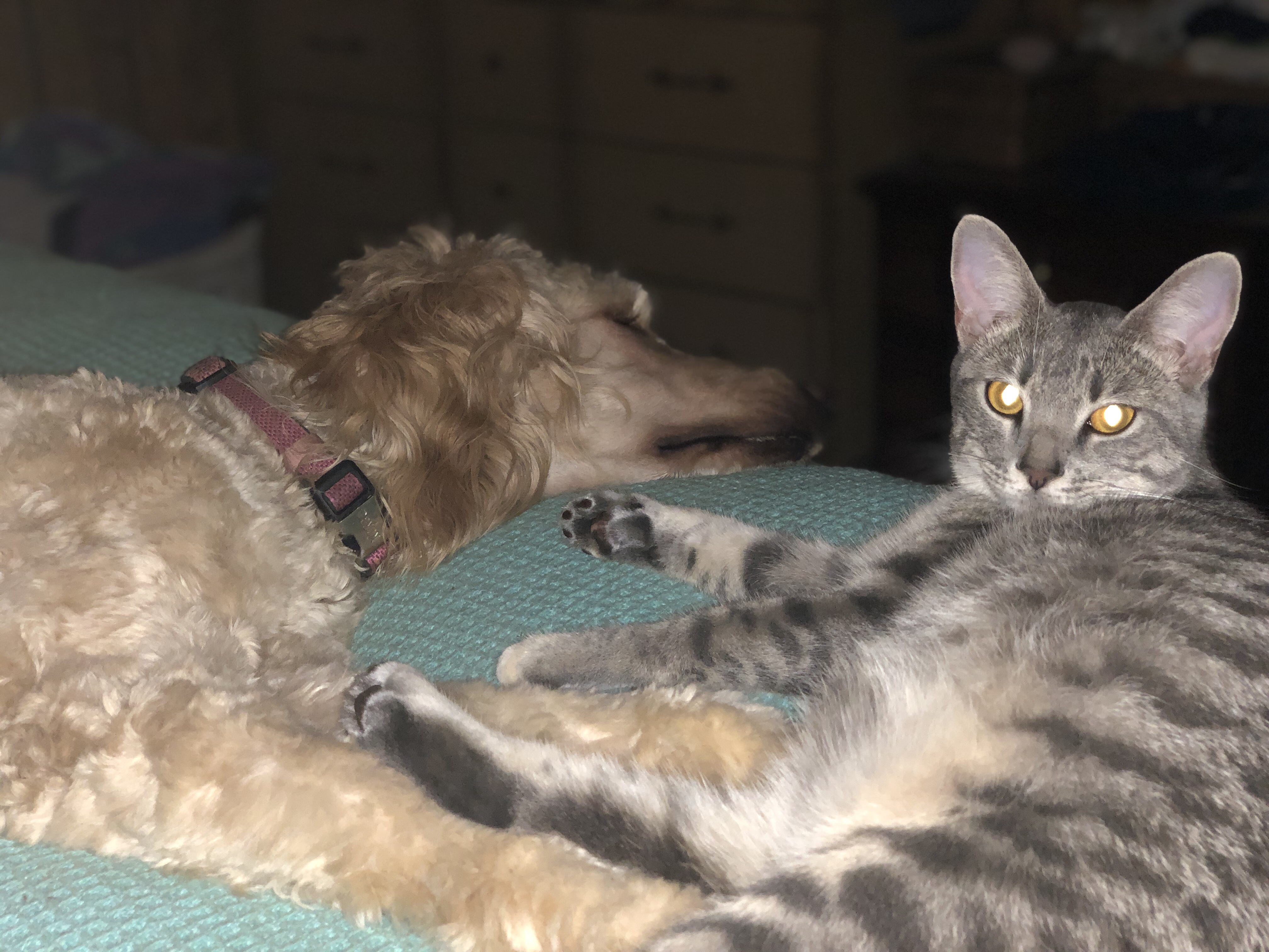 I’ve got two critters under my care, a goldendoodle and a gray cat we nursed from a week old. My pup has task training as an assistance animal, she helps me calm down with pressure therapy. The cat was found alone in my brothers attic insulation, I volunteered to keep her alive. Now she is domesticated and toilet trained.